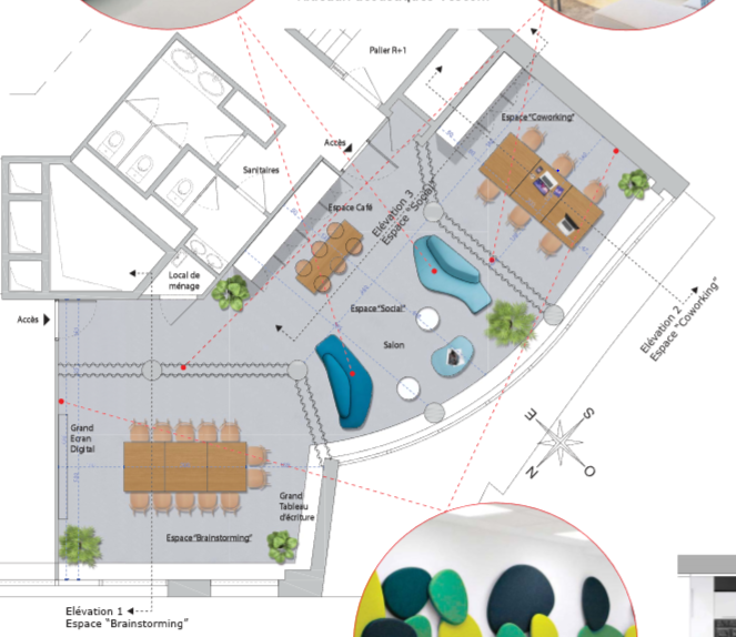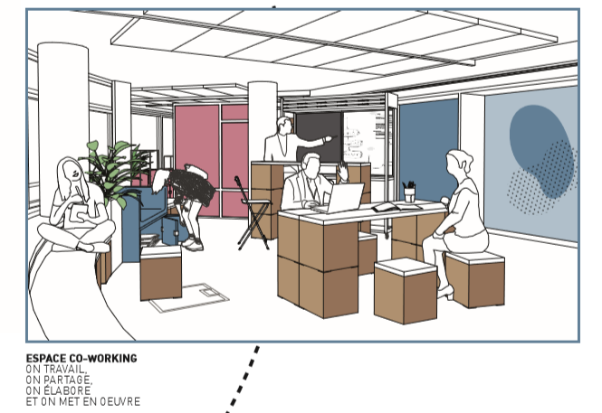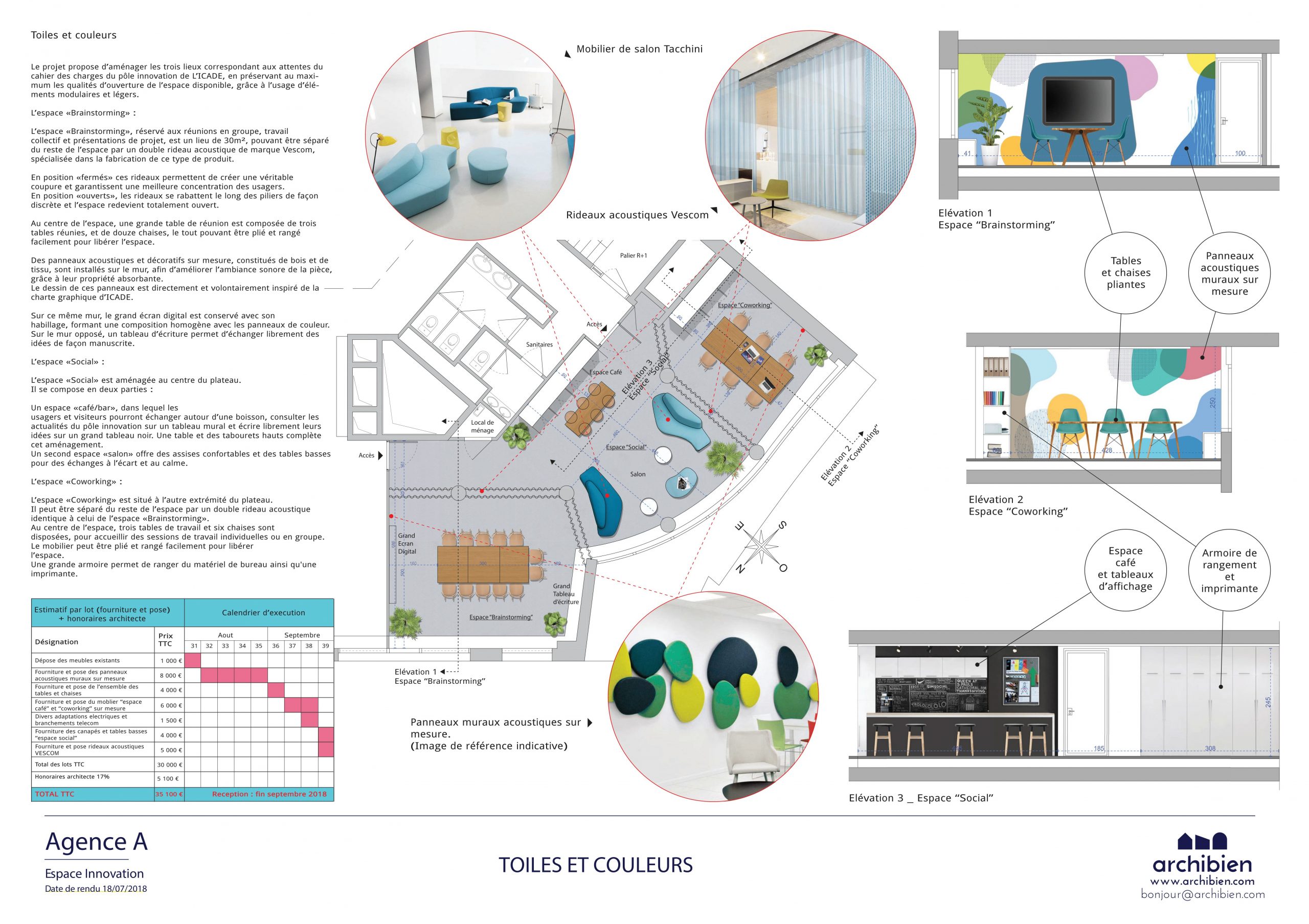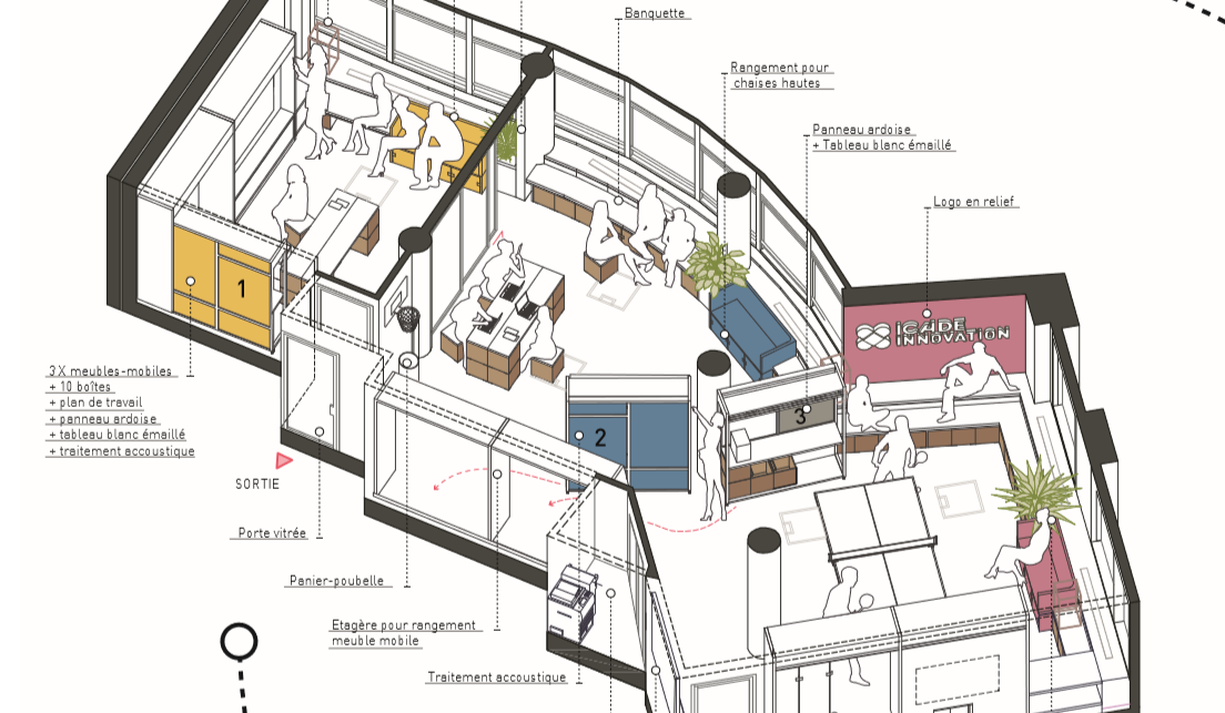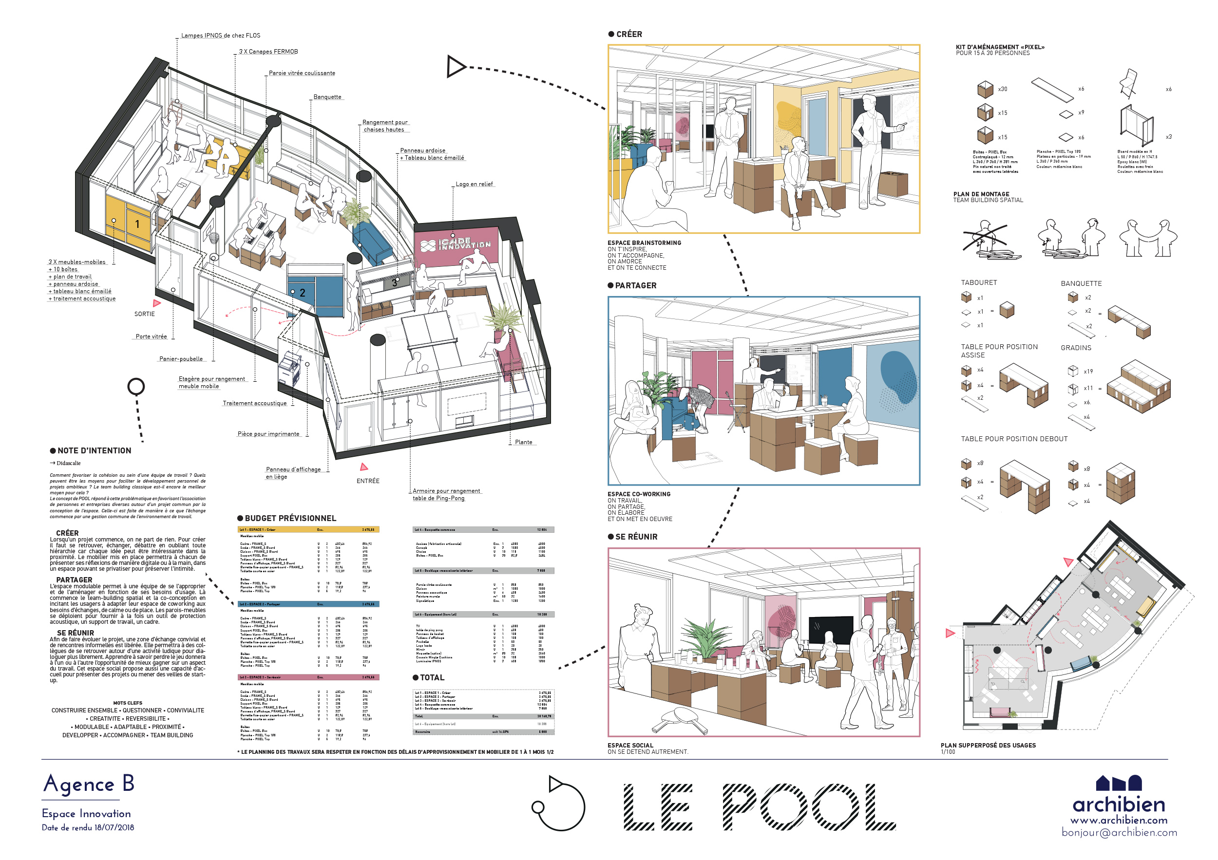 Le parti-pris de cette proposition est de prévoir un mobilier simple et modulable qui met en avant le team building et la convivialité, avec des espaces colorés renforçants les échanges et la créativité. La propositions prévoit des outils de protection acoustiques dans les supports de travail, qui deviennent alors des parois meubles, lorsque les gens ont besoin d’un moment de concentration.