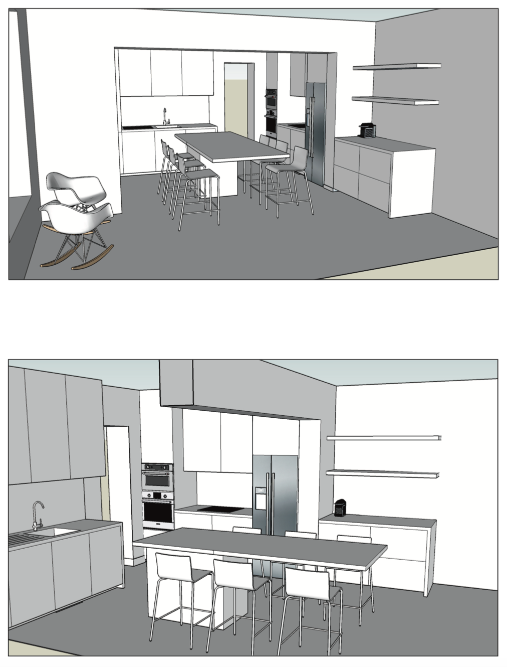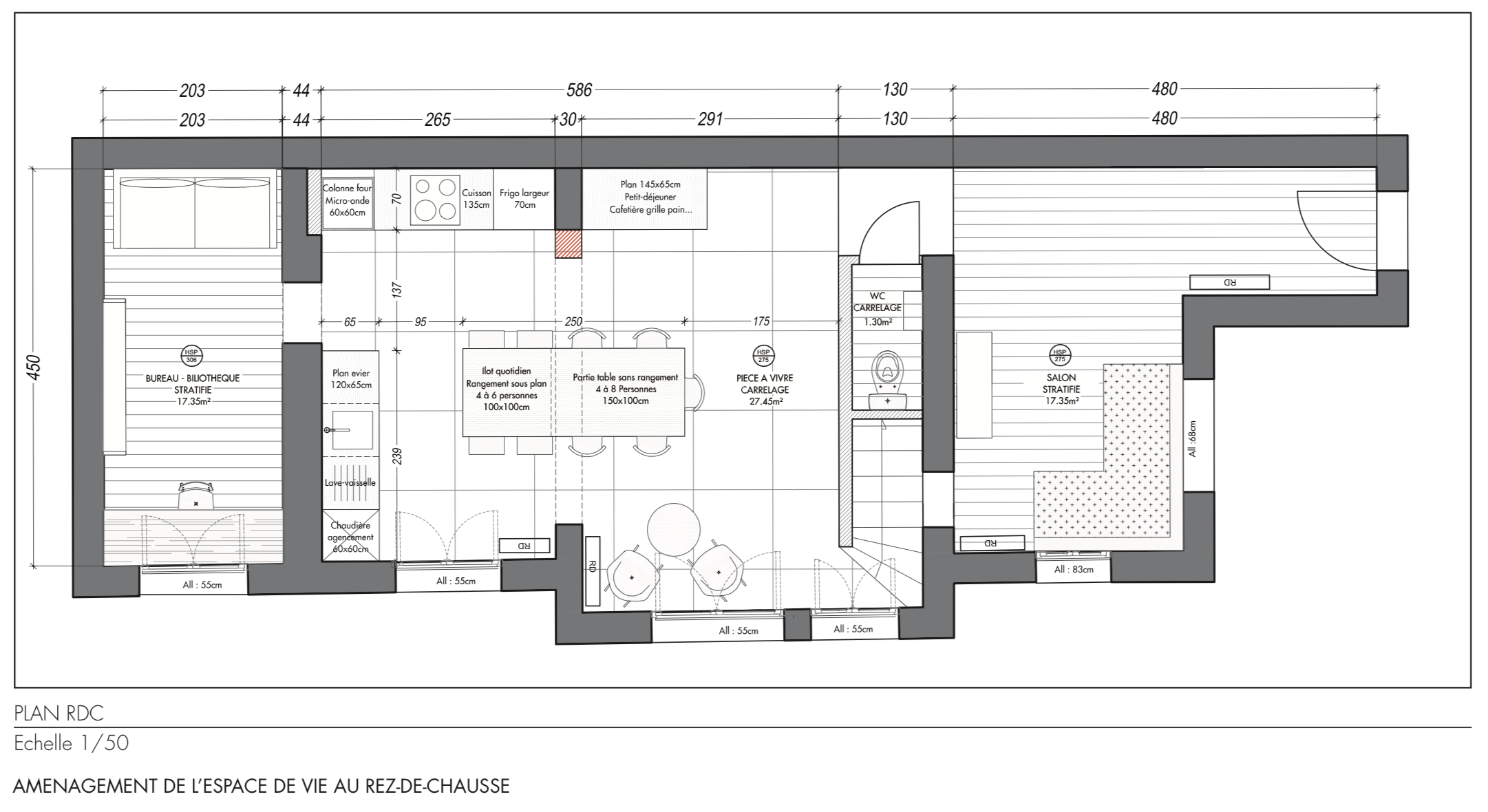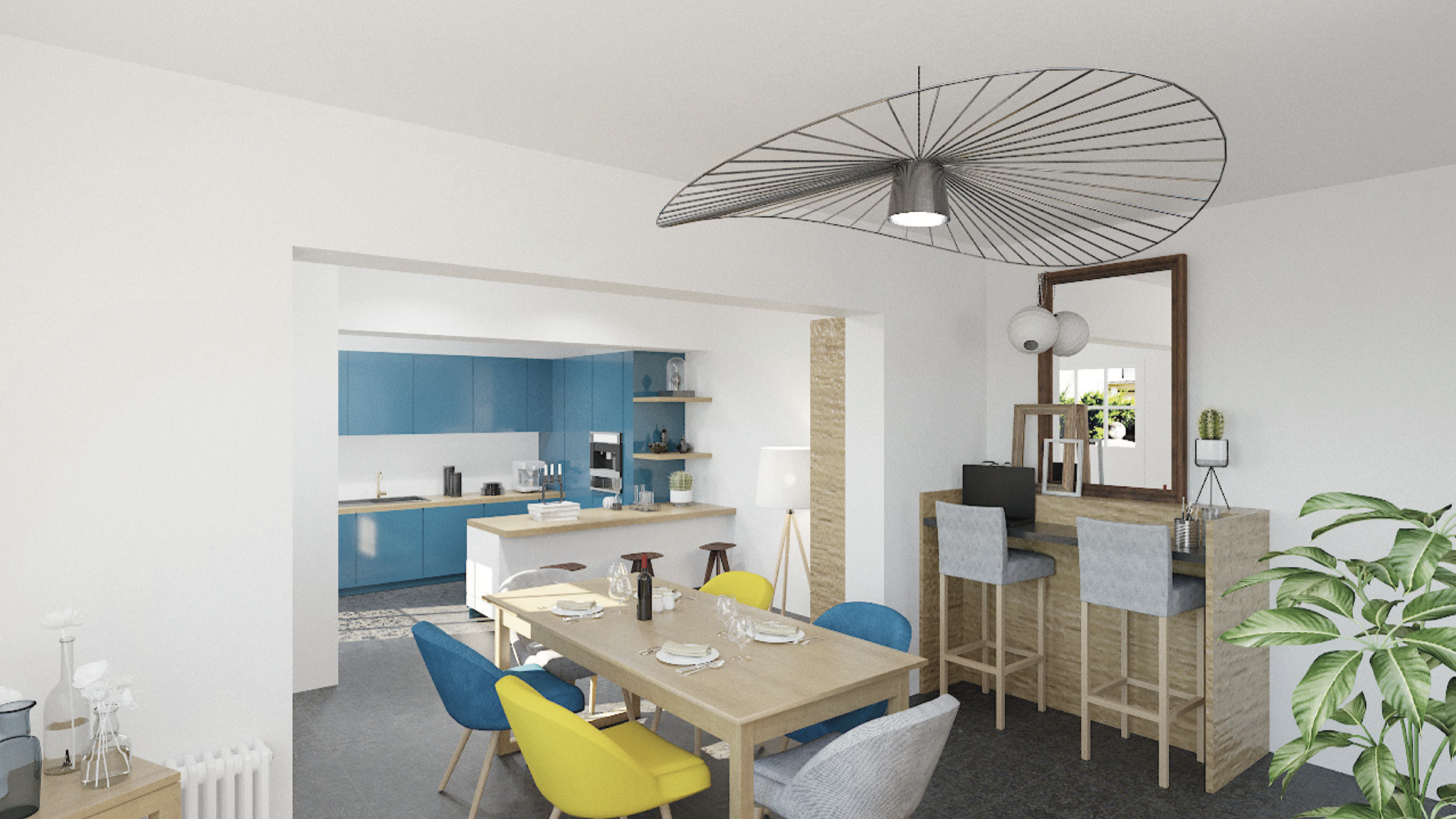 La deuxième agence propose un réaménagement de façon à ce que la cuisine devienne la pièce à vivre. Usage quotidien ou usage festif, cette pièce s’adapte à la vie de famille. Cet agencement permet également d’avoir une pièce complémentaire, cuisine et salle à manger ainsi que bureau et bibliothèque.