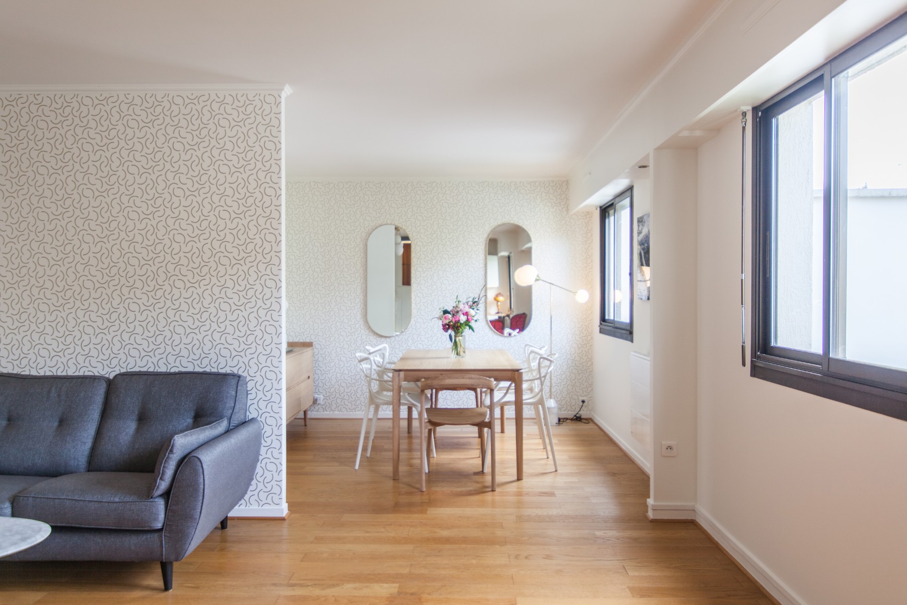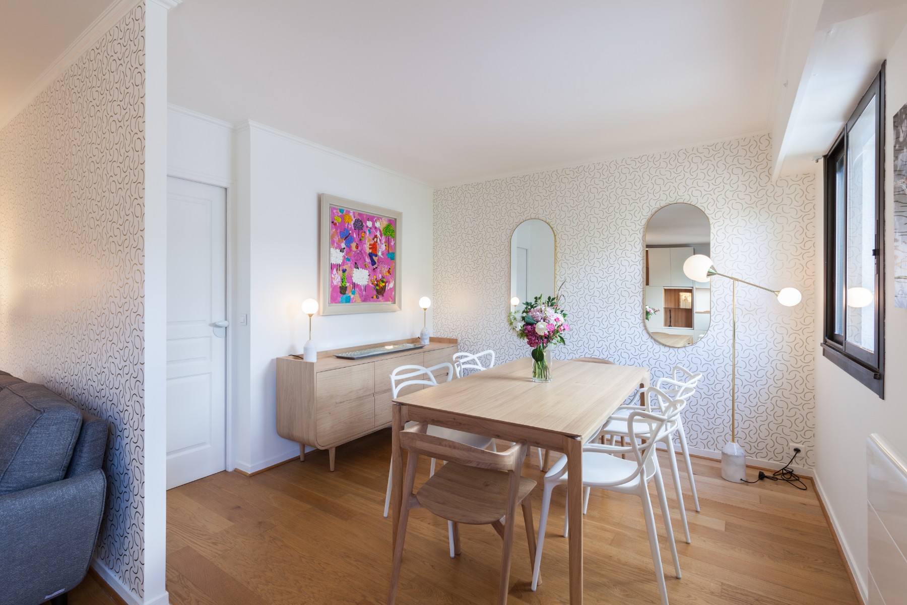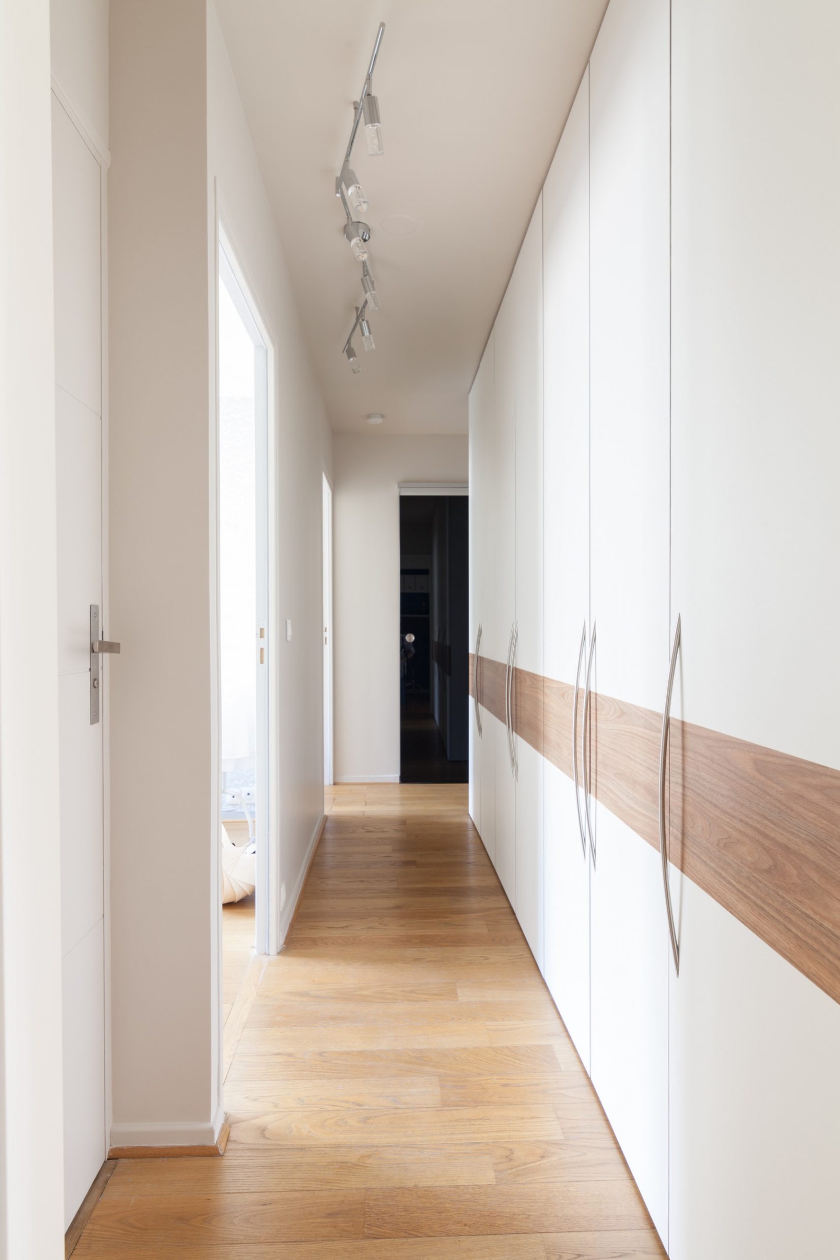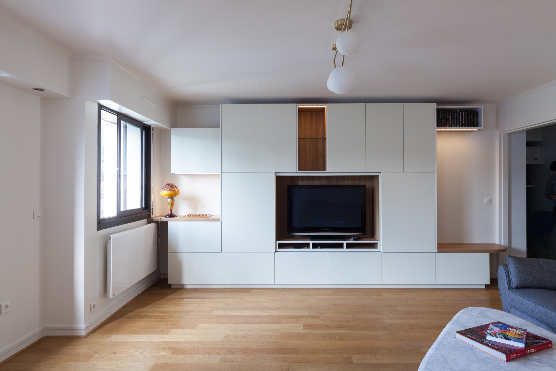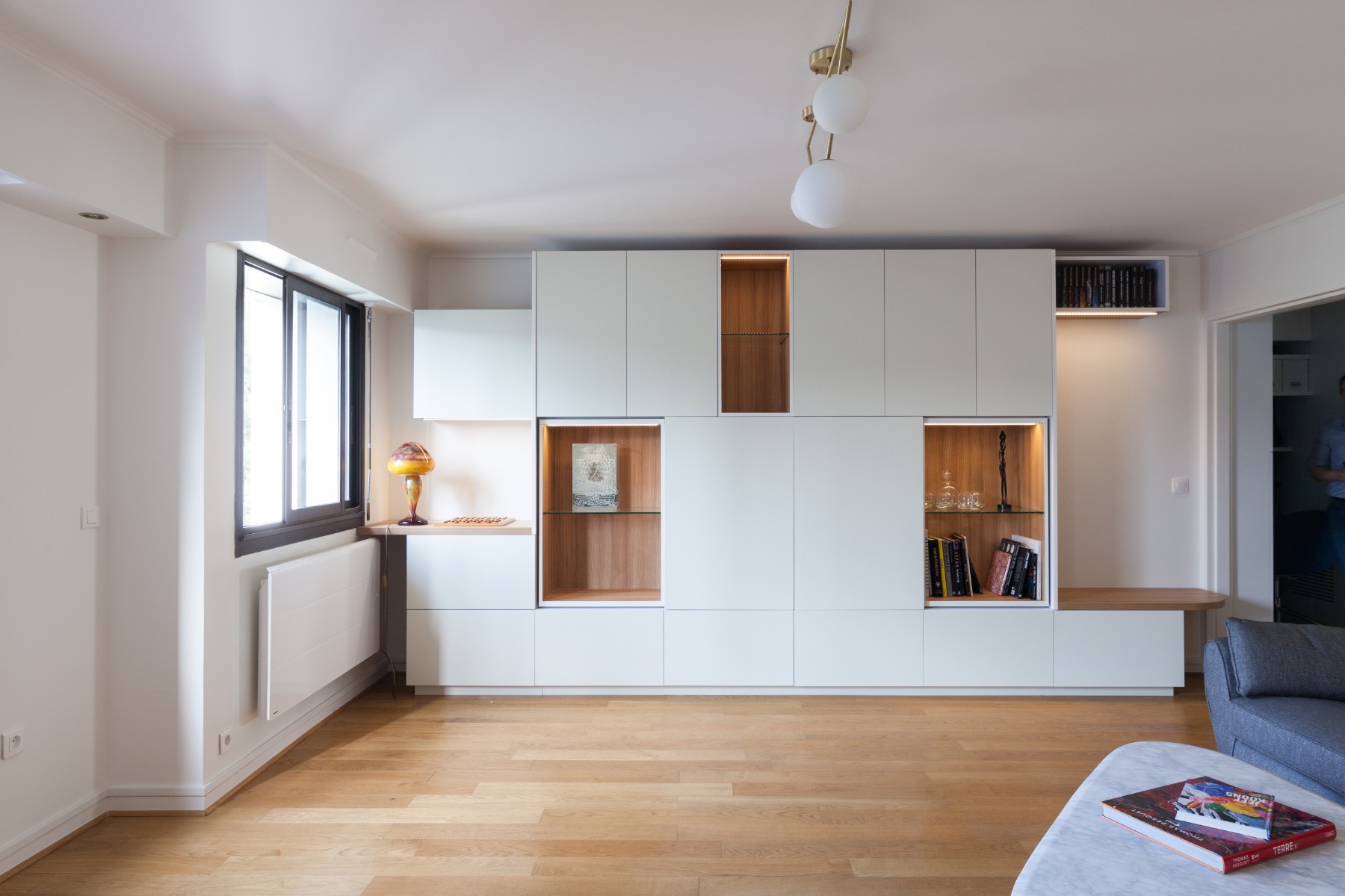Le projet de rénovation et de décoration de cet appartement s’articule autour de trois axes : simplicité, praticité et harmonie. Inspirée par le parquet existant, l’utilisation du chêne clair pour le mobilier et la conception des rangements permet d’harmoniser l’appartement. Comme un trait d’union entre les espaces.