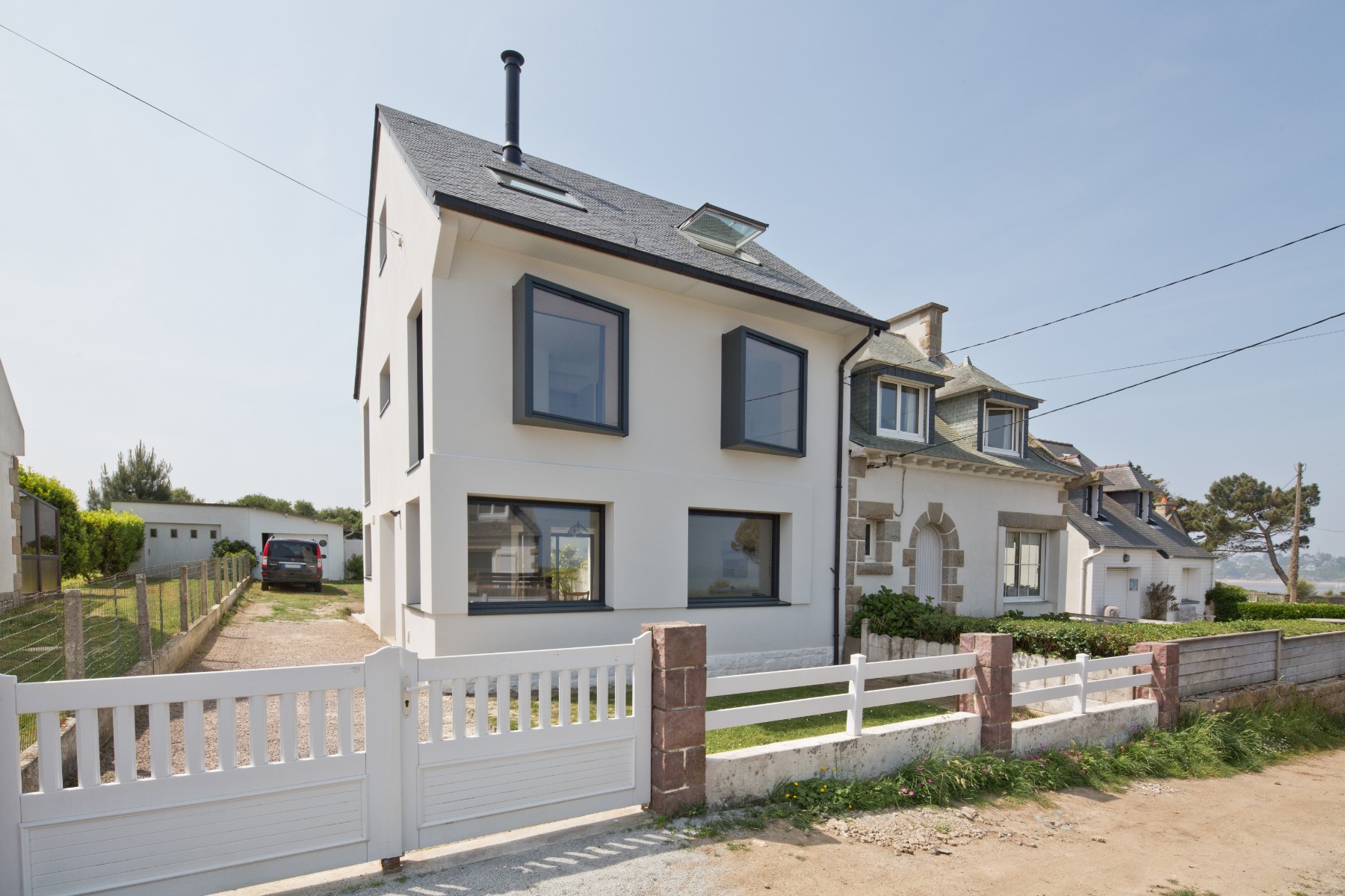 Les pièces du premier étage sont prolongées par des boites de lecture pour chercher la vue sur mer. De l’extérieur, la maison est transformée mais conserve tout son charme de maison de vacances.